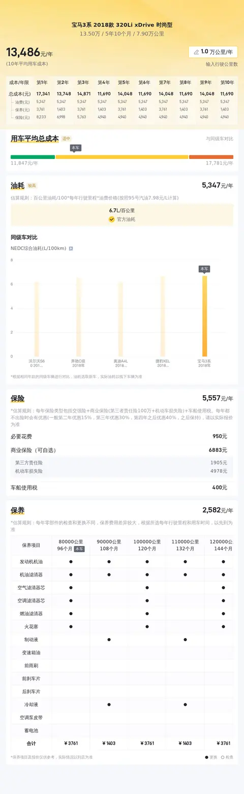 接下来我们聊聊用车成本。这款车的百公里油耗大约在6.7升左右。按照每年行驶2万公里计算每年的油费大约在11473元左右。保险费用方面根据估算每年的保险费用大约在5178元左右。保养费用方面根据估算每年的保养费用大约在2678元左右。其他费用方面如车停费洗车费等根据个人情况而定。总的来说这款车的用车成本相对较高需要在购买前做好充分的预算和准备。