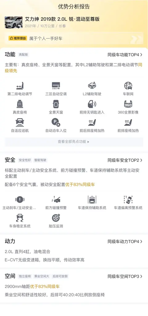 通过分析这款车在同级别车型中的表现,艾力绅 2019款 2.0L 锐·混动至尊版在配置、动力、安全、空间四个方面中,配置、动力、空间处于同级别车型的较好水平,尤其是混动系统具有明显的燃油经济性优势;但在安全方面则相对一般。
