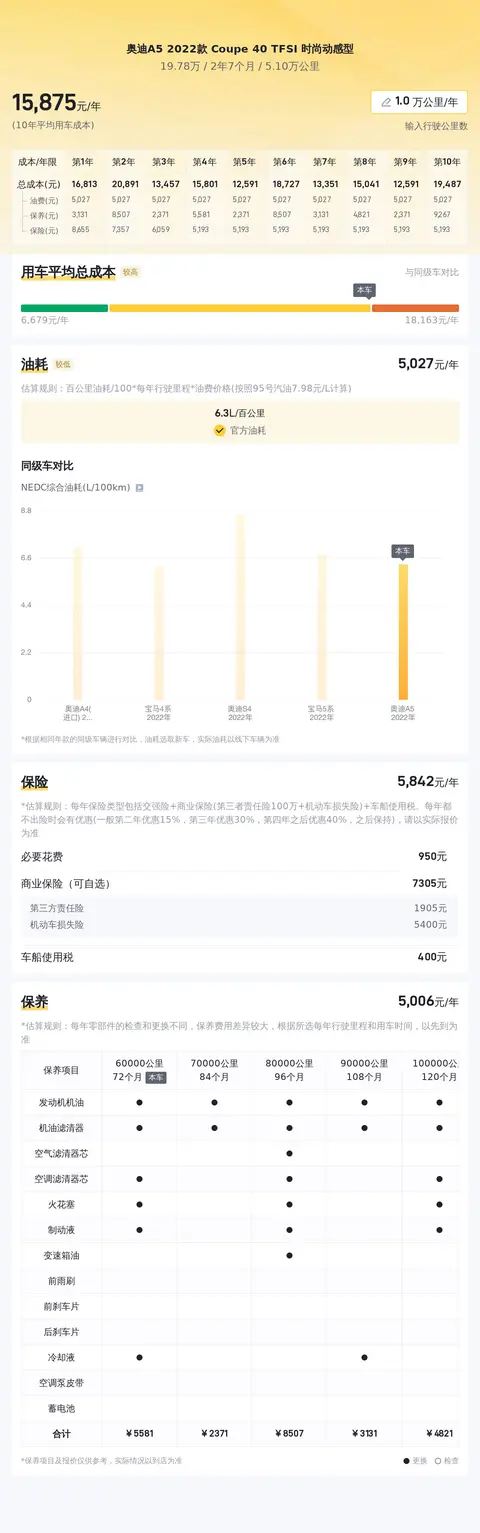 关于用车成本,根据估算,这辆奥迪A5的年均综合用车成本约为1.6万元,其中包括油费、保险费和保养费等。请注意,具体费用可能会因用车强度和环境等因素而有所变化。