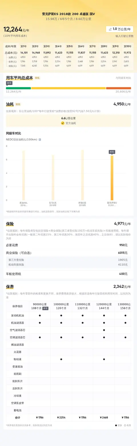 在不考虑折旧成本的情况下,这款车的平均使用成本约为12,169元/年。这项开支具体会落实到油费、保养费、保险费等几大类别里,而这些费用又跟行车里程、使用年份等因素有着直接或间接的联系。想更清楚地了解这辆车的使用成本?让我们往下看。