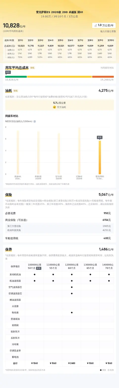 根据懂车帝对雷克萨斯ES 2020款 200 卓越版 国VI的分析,这款车型的10年平均用车成本约为11,405元/年。这一数据基于多种因素的综合考量,包括油费、保养费、保险费等,并考虑了车辆里程数和车龄等因素的影响。在用车成本方面,这款车型的表现相对较为经济合理,适合追求性价比的消费者选择。