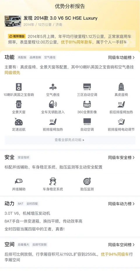 综上所述的新车含税价、用车成本、市场行情、优势分析、同款比价等数据仅供参考。在配置部分,因为二手车非标品,车辆可能会存在配置改装的情况,具体车况信息需要线下结合车辆实际情况进行综合参考。
