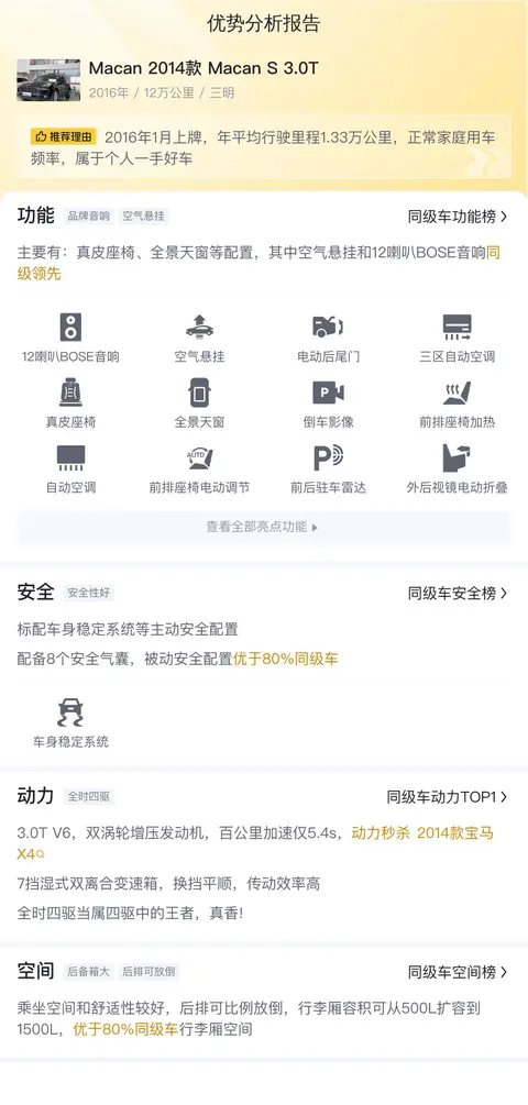 综上所述,Macan 2014款 Macan S 3.0T是一款集豪华、性能和舒适于一体的中型SUV。它在动力性能、操控、内饰品质和品牌价值等方面表现出色,是一款值得推荐的车型。但是,Macan的燃油经济性不佳、后排空间相对狭窄以及维护保养成本较高,这些都是消费者在购买时需要权衡的因素。总体而言,如果您追求卓越的驾驶体验和豪华感,并且能够接受较高的维护成本,那么Macan绝对是一个不错的选择。