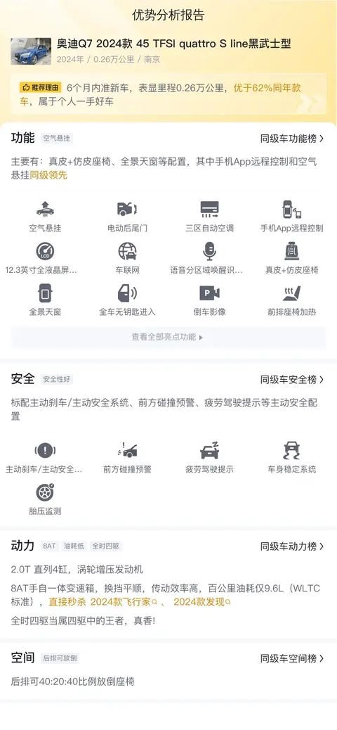 综上所述的新车含税价、用车成本、市场行情、优势分析、同款比价等数据仅供参考。在配置部分,因为二手车非标品,车辆可能会存在配置改装的情况,具体车况信息需要线下结合车辆实际情况进行综合参考。
