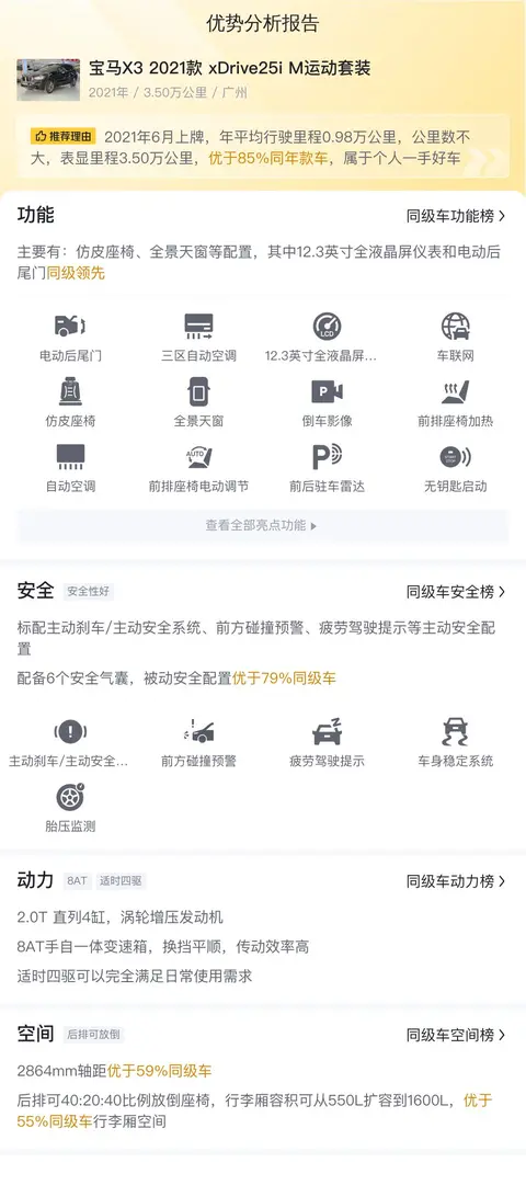 里程:该车行驶里程为3.5万公里,里程较少,较同款二手车而言,价格增加5800元左右。