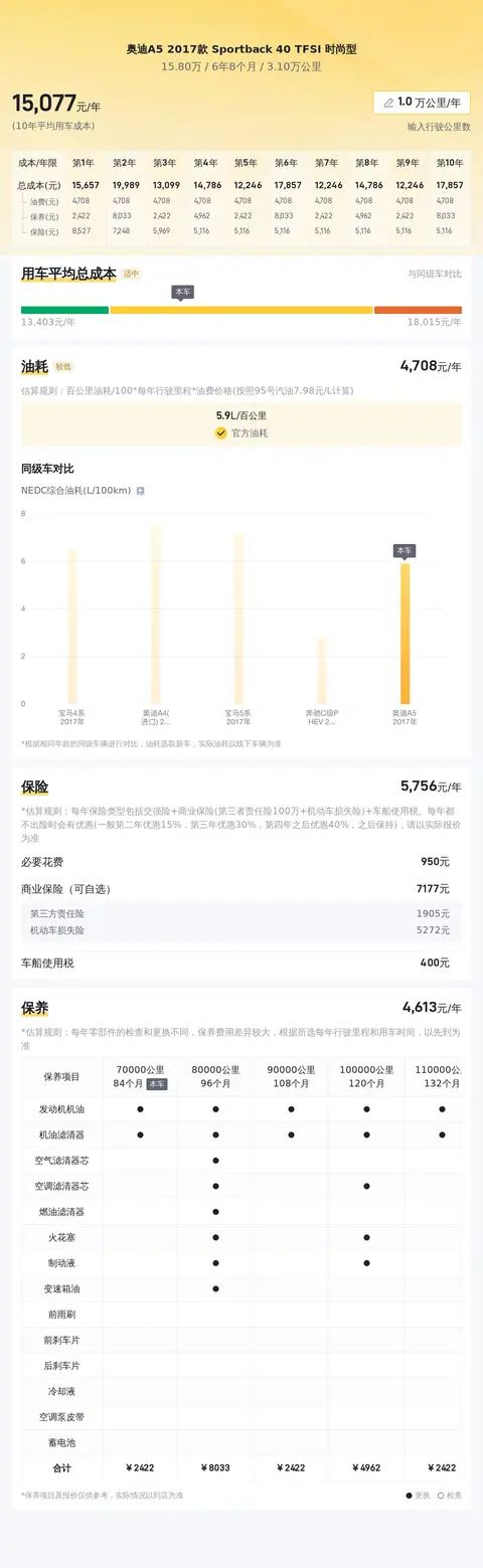 经过懂车帝大数据分析,这辆奥迪A5 2017款 Sportback 40 TFSI 时尚型的10年平均用车成本大约在14793元/年,具体费用要看车主的实际使用情况。