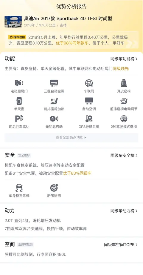 这辆奥迪A5 2017款 Sportback 40 TFSI 时尚型,上牌日期2018年5月,表显里程3.1万公里,该车符合国V排放标准。车源地和上牌地都是吉林,没有过户记录,个人一手车。