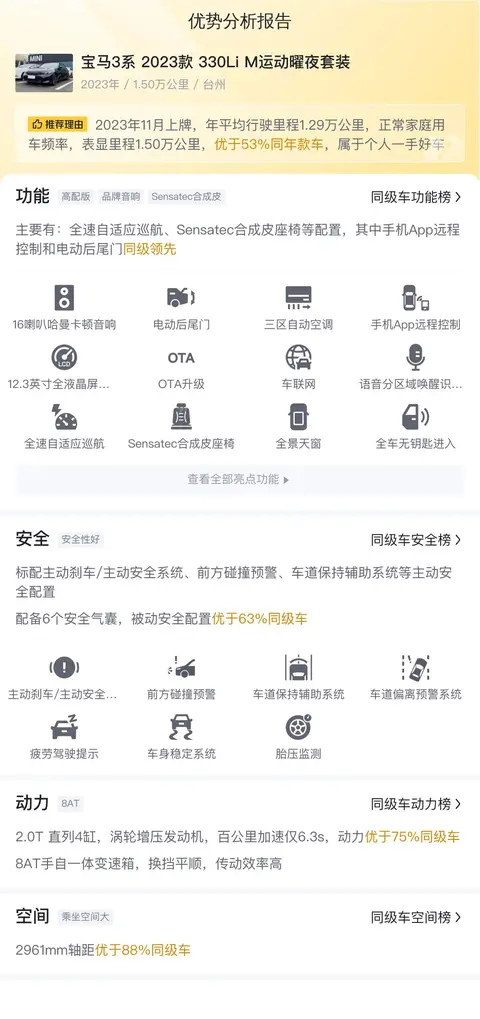 综上所述的新车含税价、用车成本、市场行情、优势分析、同款比价等数据仅供参考。在配置部分,因为二手车非标品,车辆可能会存在配置改装的情况,具体车况信息需要线下结合车辆实际情况进行综合参考。