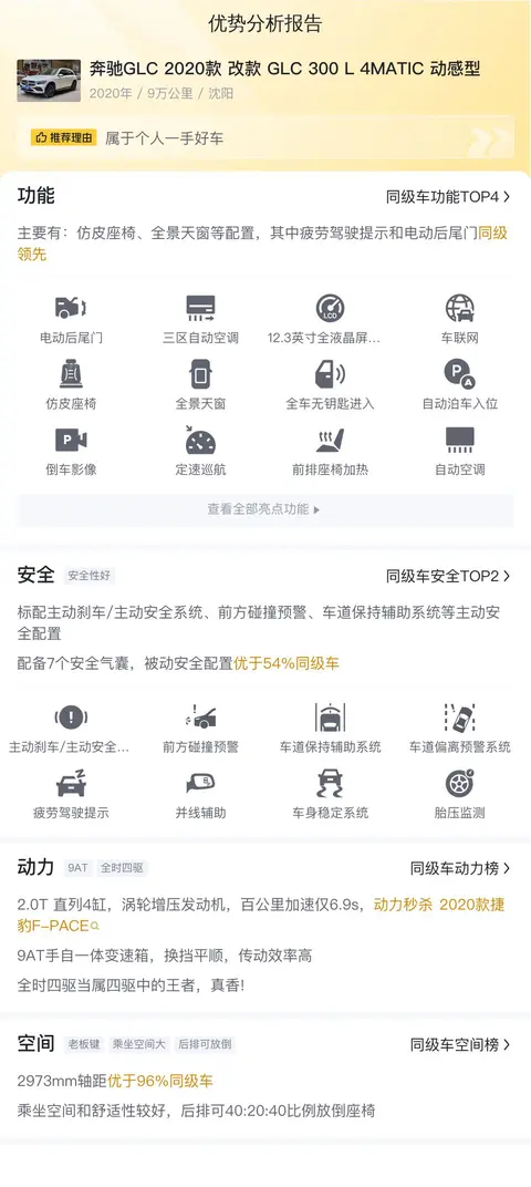 2018年10月17日,奔驰GLC(图片|配置|询价)迎来了自己的高光时刻——北京奔驰GLC长轴距版正式上市,作为一款专为市场打造的车型,它有着独特的魅力。GLC长轴距版共有5款车型供消费者选择,售价区间为42.98-58.78万元。自北京奔驰GLC长轴距版上市以来,凭借其出色的空间表现和丰富的配置,赢得了众多消费者的青睐。今天要说的这辆奔驰GLC 2020款 改款 GLC 300 L 4MATIC 动感型,车源地是沈阳,外观为白色,2020年5月上牌,未过户,表显里程9万公里,新车含税价49.1万,二手车报价25.3万。