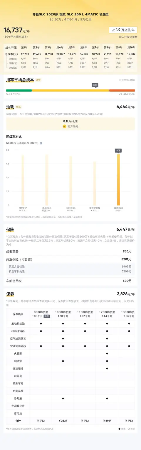 关于用车成本,根据大数据测算,奔驰GLC 2020款 改款 GLC 300 L 4MATIC 动感型的10年平均用车成本约为17,580元/年。