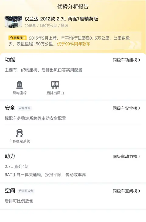 2000年,丰田汉兰达(图片|配置|询价)问世,迅速因其宽裕的乘载能力和优异的驾乘感受而闻名。我国消费者对汉兰达的认知始于其国产版本的面市,那是2009年,广汽丰田正式将汉兰达引入国内生产。汉兰达在我国市场一直保持着坚挺的售价和稳定的市场需求,二手车市场也是如此。今天我们就为您带来一辆二手汉兰达,具体版本为汉兰达 2012款 2.7L 两驱7座精英版。先说一下这辆车的基本信息,该车外观为黑色,上牌日期为2015年2月,表显里程为1.5万公里,上牌地和车源地均为潍坊,过户次数为1次,排放标准为国Ⅳ(国Ⅴ)。这辆二手车的新车指导价为26.28万元,而当前的卖家报价为13.78万元。