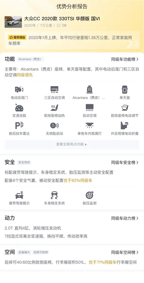 大众CC 2020款 330TSI 华颜版 国VI的内饰用料讲究,采用Alcantara(麂皮)座椅,副驾座椅有化妆镜+照明,既实用又照顾到了女性,增加乘车舒适度。从安全配置看,标配疲劳驾驶提示、车身稳定系统、胎压监测等主动安全配置,配备6个安全气囊,被动安全配置优于90%同级车。从空间看,后排可40:60比例放倒座椅,行李厢容积501L,优于71%同级车行李厢空间。从动力看,2.0T 直列4缸,涡轮增压发动机,7挡湿式双离合变速箱,换挡平顺,传动效率高。从视野看,车外后视镜支持电动折叠,双区自动空调,在同级车型中表现一般。从驾驶辅助看,只支持定速巡航,不支持全速自适应巡航,也不支持360度全景影像,从同级车型来看,表现一般。从亮点配置看,主要有电动后尾门、三区自动空调等配置,其中电动后尾门和三区自动空调同级领先。