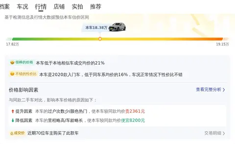 二手车的定价远比新车复杂,每辆车的车况不同,价格差异也大。我们为您做了市场行情的调查,助您判断这辆车的价格是否合理。奥迪Q5L 2020款 改款 40 TFSI 荣享进取型的市场行情大致在18.74万至23.16万之间,本车的报价为18.38万,价格上是有优势的,本车是2020款入门车,年均行驶里程较少,为2万公里/年,车况正常情况下性价比不错。