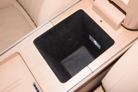 副仪表台设计了两层。不但有皮质包覆,还搭配了木纹饰面和镀铬饰条等。看起来很整洁很清新。下层的托盘可以容纳两瓶放倒的550ml的矿泉水。由于是镂空的设计,塞个大的行李包进去是没有问题的。上层配了两个杯架和可以放2个手机的浅盘。带有一个50W手机无线充电板。后方扶手箱很深很能装。550ml的矿水直着放也能合上扶手箱的盖子。底部做了防滑处理,还配了灯光照明。细节设计挺足的。值得一提的是,这款车的星动吧台。可以通过按键和语音在前后排之间移动。往后挪,可以给后排乘客放东西。下车的时候发现司机一侧比较狭窄,也可以将星动吧台后移。这样司机就可以轻松走到副驾的位置,在副驾侧优雅地下车。