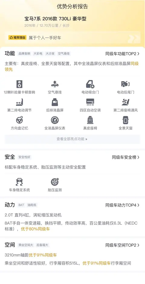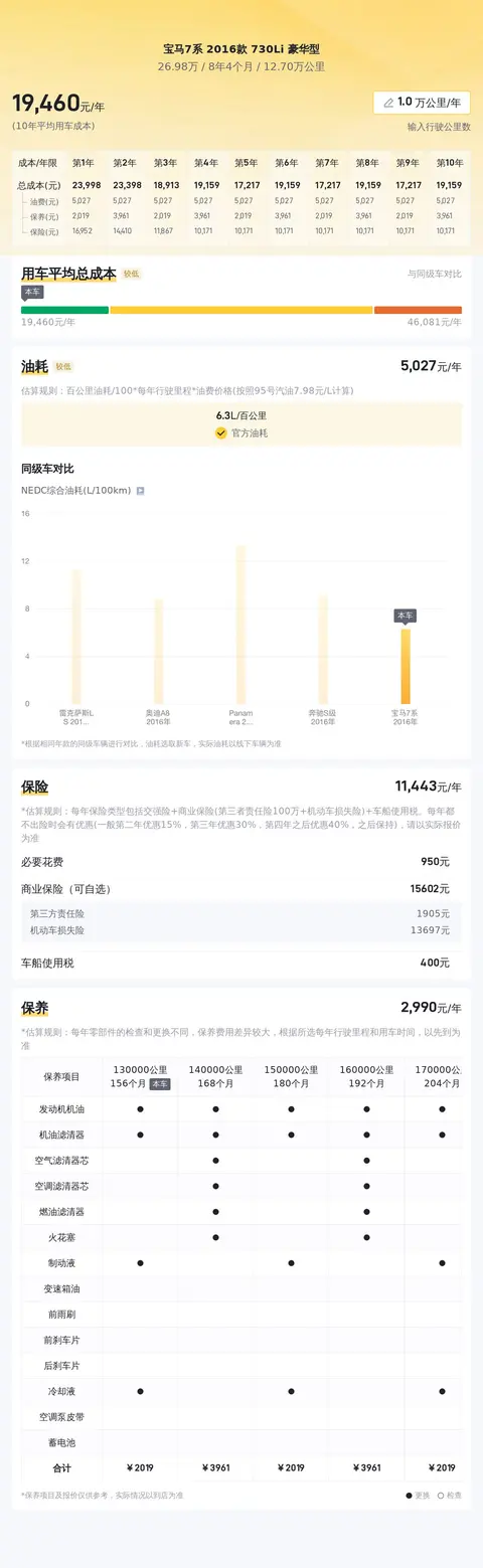 宝马7系 2016款 730Li 豪华型的10年平均用车成本是19022元/年,6.3L的油耗,较低。