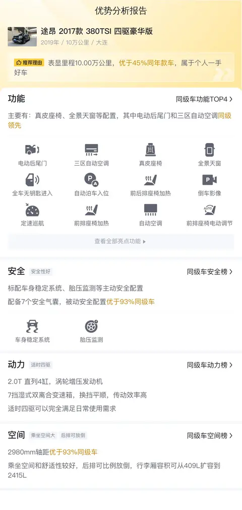 这辆途昂配备了真皮座椅、全景天窗等配置,其中电动后尾门和三区自动空调同级领先。在安全配置上,配备7个安全气囊,被动安全配置优于93%同级车,安全性更让人放心。从功能配置上来看,这辆途昂整体表现不错,具体还需您实地体验一把。