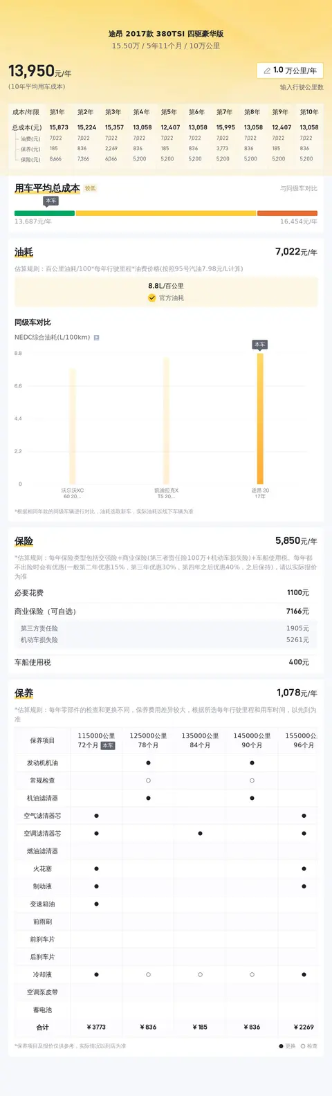 对于选择二手车的消费者来说,除了购车成本,还需要考虑用车成本。根据估算,这辆途昂的年均综合用车成本约14070元(按每年行驶1万公里计算),实际费用支出跟车主用车习惯和行车环境有直接关系。
