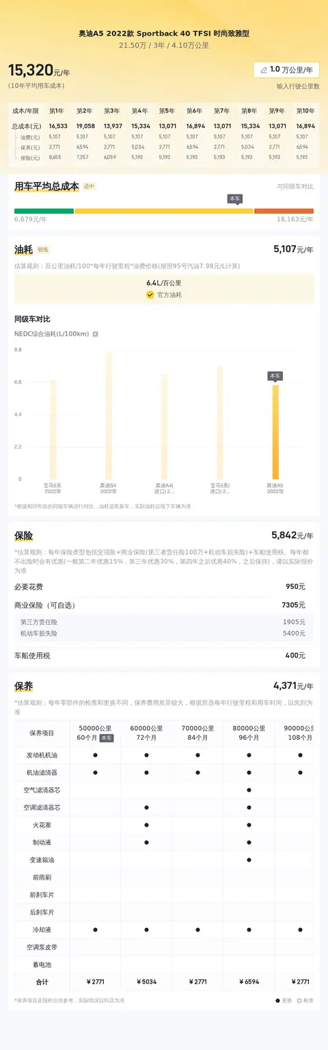 经过懂车帝综合分析,奥迪 A5 2022 款 Sportback 40 TFSI 时尚致雅型的10年平均用车成本大约在15137元/年,这一数据位于同类车型中的较高位置。较高的用车成本主要与该车保险费用较高(约5681元/年)以及保养费用适中(约1707元/年)等因素有关。相比之下,奥迪 A5 2022 款 Sportback 40 TFSI 时尚致雅型的油耗表现较为优秀,百公里油耗约为7.1升,即约5402元/年,这一油耗水平在同类车型中处于较低的位置。油耗低意味着燃油成本相对较低,这对于追求经济性的驾驶者来说是一个积极的因素。总体而言,尽管奥迪 A5 2022 款 Sportback 40 TFSI 时尚致雅型的用车成本在同类车型中偏高,但其油耗表现的良好仍然为其提供了一定的经济性优势。然而,对于那些对用车成本特别敏感的消费者来说,他们可能需要考虑其他具有更低用车成本的车型。