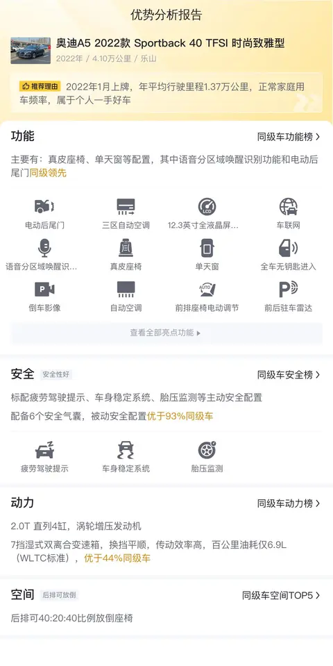 今天介绍的这款奥迪A5 2022款 Sportback 40 TFSI 时尚致雅型,是一辆2022年1月上牌的前驱车型,行驶里程4.1万公里。新车指导价37.98万,现在二手报价21.5万,约0.5万的差价,考虑入手奥迪A5的车友们可以参考一下。