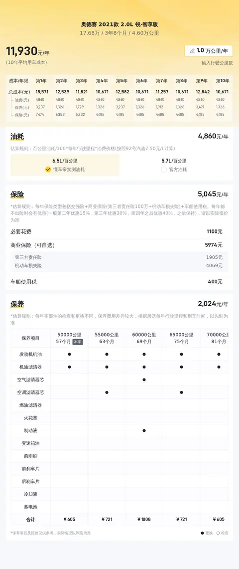 根据大数据预估显示,这款车型在全国二手车市场的价格区间为16.6万至20.14万元。具体售价会根据车辆的状况(如车龄、里程、保养情况等)而有所不同。至于用车成本方面,预估的年均综合用车成本约为1.2万元,这一数字较之同级别车型并无明显优势,但在合理范围内。