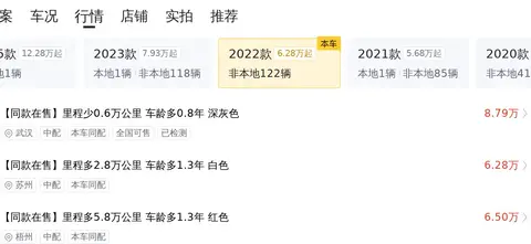 在市场行情部分,这辆车目前的售价处于合理的区间内,同时考虑到车辆的里程、车龄、过户次数等因素对价格的影响,这辆车目前的售价10.38万,预计再行驶2年后可卖8万,约折价22.1%,保值率还是不错的,当然,具体的价格还需要根据车辆的实际状况和市场行情来进行最终的评估确定。