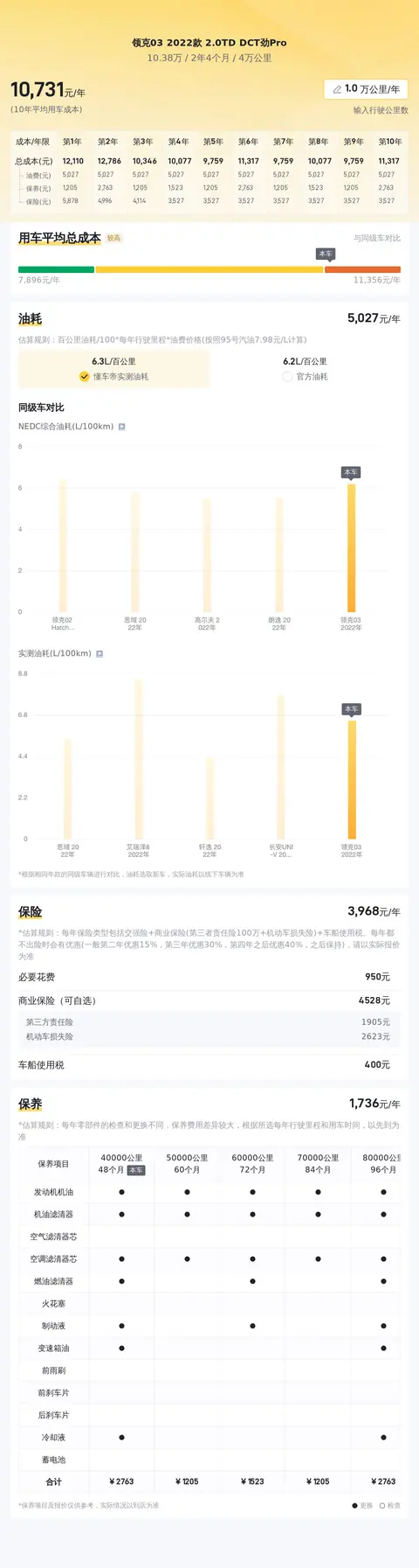 在用车成本上,这辆车年均综合用车成本大概在每年1.1万元左右,不过这个跟每个人的用车场景和驾驶习惯有直接关系,所以这个费用只能是个参考。