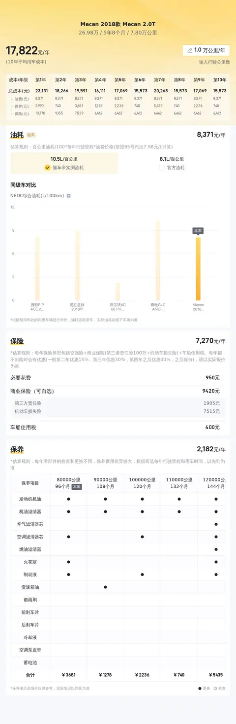 这辆车的年均综合用车成本大概在每年1.8万元左右,实际费用开销会根据车主的使用习惯而有所差异。