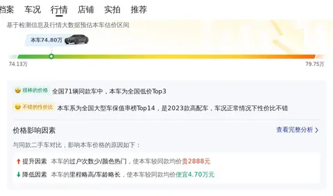 接下来,我们参考一下这辆车在当前市场的行情价格,以及未来几年的保值率。根据大数据统计的显示,该车目前的售价为74.8万,预计再行驶2年后可卖58万,约折价21.4%。这个保值率还是不错的,当然车辆最终的售价会根据车辆的车况而有所不同。