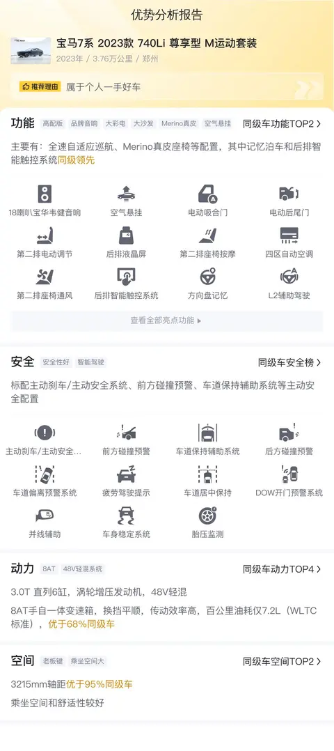 最后,我们来总结一下这辆车的优点,以便您更好的了解这辆车。在功能配置方面,全速自适应巡航、Merino真皮座椅等配置,其中记忆泊车和后排智能触控系统同级领先。动力部分,3.0T 直列6缸,涡轮增压发动机,48V轻混,8AT手自一体变速箱,换挡平顺,传动效率高,百公里油耗仅7.2L(WLTC标准),优于68%同级车。空间部分,3215mm轴距优于95%同级车,乘坐空间和舒适性较好。价格部分,这辆车目前售价74.8万,预计再行驶2年后可卖58万,约折价21.4%,保值率还是不错的。从车况来看,这辆车已经通过了重大事故、泡水、火烧检测,可以确定它非重大事故车、非火烧车、非泡水车。综合各方面来看,这辆车的表现还是不错的,如果您正在寻找一款豪华轿车,那么这辆车值得您考虑。
