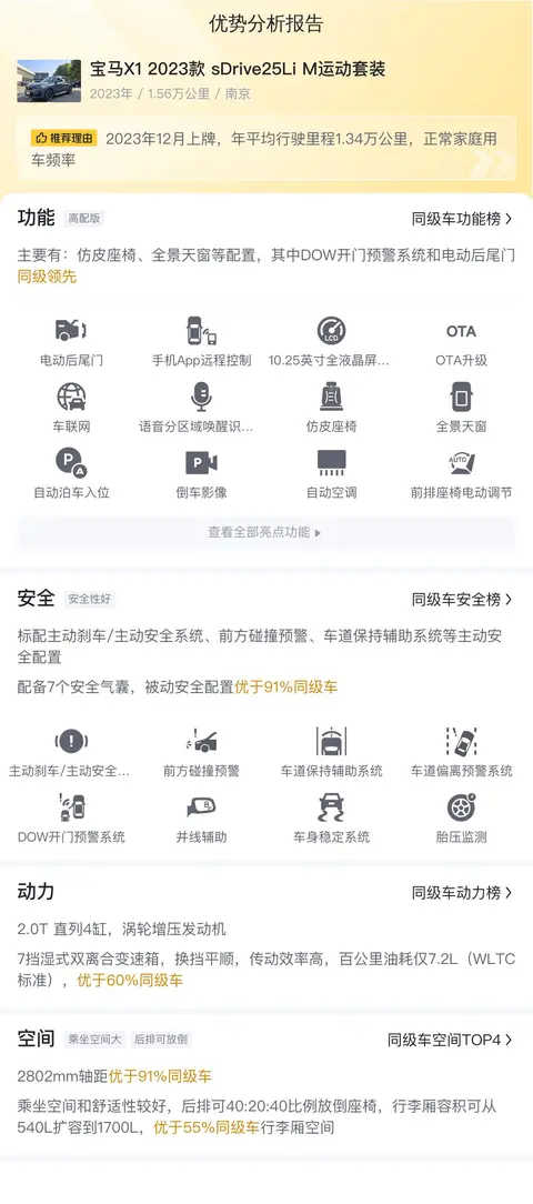 该车品牌为宝马,具体型号是宝马X1 2023款 sDrive25Li M运动套装,车身颜色为深灰色,级别为紧凑型SUV。累计行驶里程1.56万公里,该车在2023年12月正式上牌,车龄不到两年,并且只有一次过户记录。车源所在地和上牌地均为南京。新车指导价31.69万,而现在的二手车报价为18.5万,开两年便宜了13.19万。