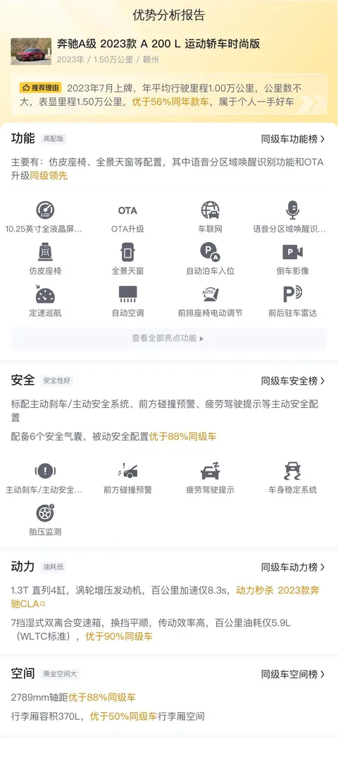 首先,我们来了解一下这辆二手奔驰A级的基本情况。该车具体版本为——奔驰A级 2023款 A 200 L 运动轿车时尚版,上牌地为赣州,上牌日期2023年7月,表显里程1.5万公里,车身颜色红色,无过户记录。新车指导价26.48万,二手车报价15.99万。