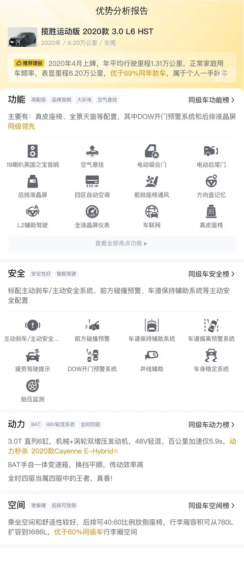 综上所述的新车含税价、用车成本、市场行情、优势分析、同款比价等数据仅供参考。在配置部分,因为二手车非标品,车辆可能会存在配置改装的情况,具体车况信息需要线下结合车辆实际情况进行综合参考。