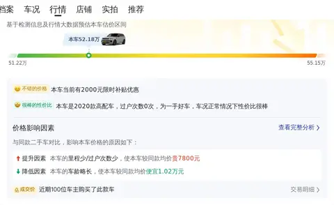 最后,影响二手车价格的因素有很多,包括车龄、里程、过户次数等,根据市场行情显示,这台二手揽胜运动版在车况正常的情况下,市场价格在48.53万至58.56万之间。具体的价格因车辆的状况而异。您所看到的这台车的报价为52.18万,距离下一次调价还有3天倒计时,您可以结合这辆车的车况来综合判断这个价格是否合适,希望我们的讲解能帮助您顺利选购爱车,祝您购车愉快!