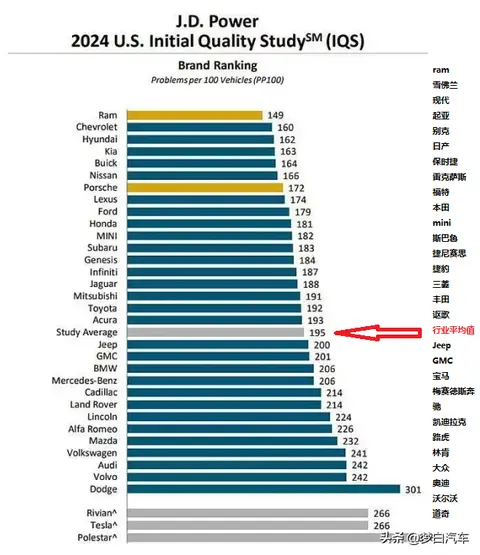 美系、韩系完成逆袭,居然包揽了榜单前五名,这是史无前例的,居然没有日系品牌入榜前五!以皮卡为主的Ram(PP100=149个)夺得了年度质量冠军,PP100值也是远低于其它上榜品牌。雪佛兰PP(100=160个)和现代(PP100=162个)分列二三名,这一成绩显示了雪佛兰汽车和现代汽车在制造工艺、质量控制方面的进步,以及其在满足消费者需求方面所做的努力。排名四五位的品牌分别是起亚(PP100=163个)和别克(PP100=164个),此外福特汽车、Jeep和GMC等美系车企,整体质量表现也还不错。