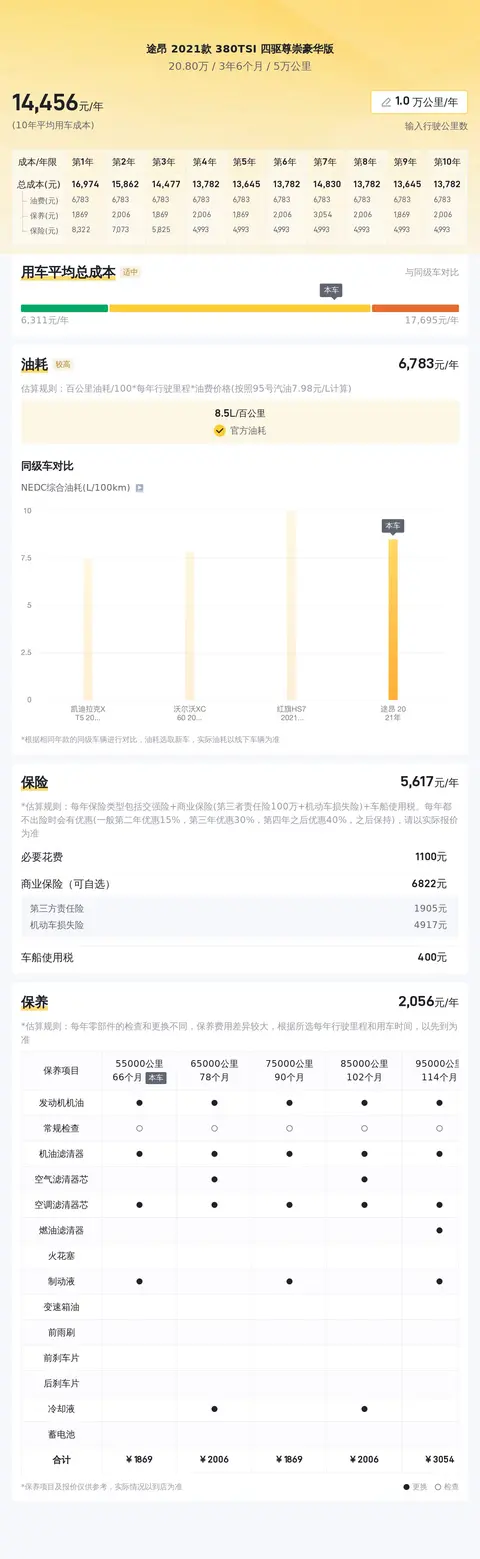 当然,买车不是一阵子的事,而是要考虑长期使用成本,根据大数据分析,这辆车的10年平均用车成本约为14173元/年,这个用车成本在同级别中处于适中的水平,是可以接受的。