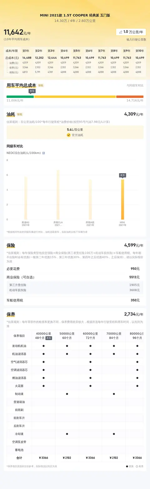 当前市场上,这款二手MINI的售价在13.65万至16.37万之间,咱们今天看的这辆报价14.3万,基本上处于合理区间。根据估算,这辆车的年均综合用车成本在1.2万元左右,当然具体还得看车主的实际使用情况而定。