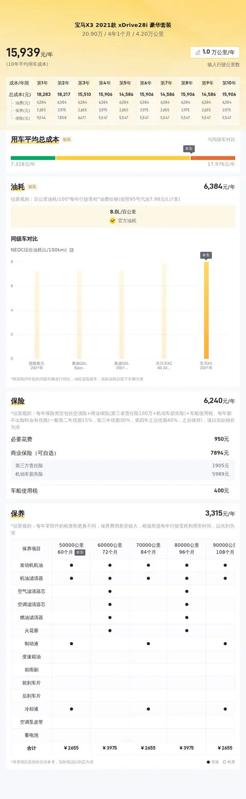 按照每年行驶一万公里计算,这辆宝马X3 2021款 xDrive28i 豪华套装的燃油费用约为9745元/年,保养费用约为4388元/年,保险费用参考值为5406元/年,年均总用车成本约19539元,用车成本适中。需要注意的是,以上数据仅供参考,实际用车成本可能会根据用车场景和个人驾驶习惯有所差异。