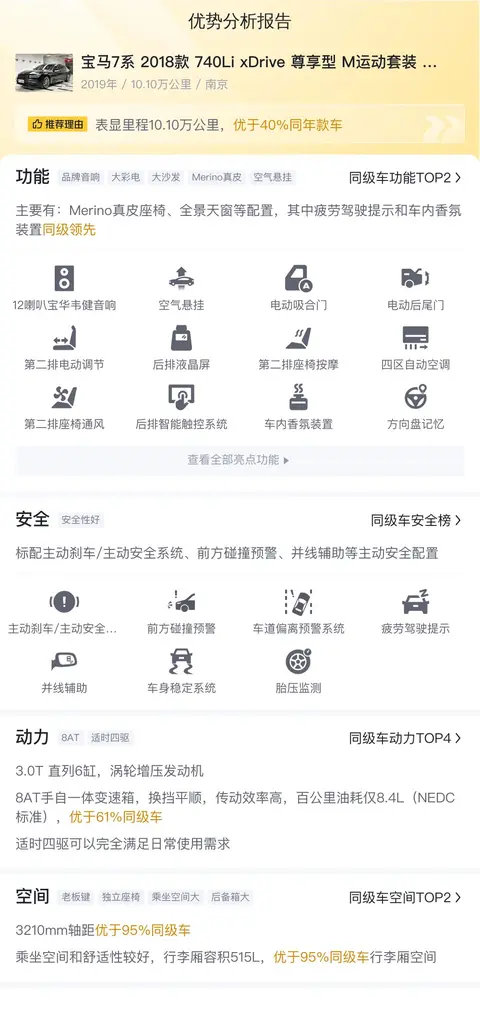 这是一辆2018款宝马740Li xDrive尊享型 M运动套装 黑焰版,是不是听着就很高端大气上档次?黑色车身,累积行驶里程10.1万公里,2019年5月上牌,牌照及车辆所在地均为南京,有1次过户记录。新车指导价高达127.8万元,而现在的二手车报价仅为36.5万元,相较于新车价格,便宜了将近90万,折扣力度相当大。