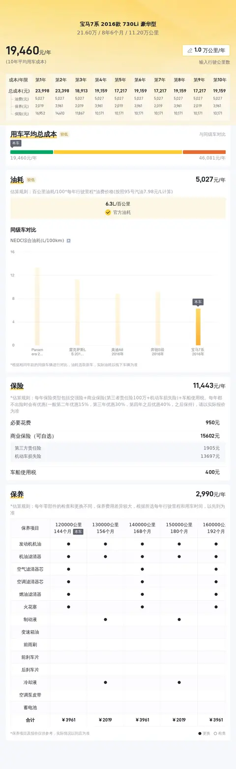 关于宝马7系2016款730Li豪华型的用车成本,根据估算,这辆车的年均综合用车成本约1.9万元左右。这项花销是跟车主的实际用车场景和使用强度有直接变化的。