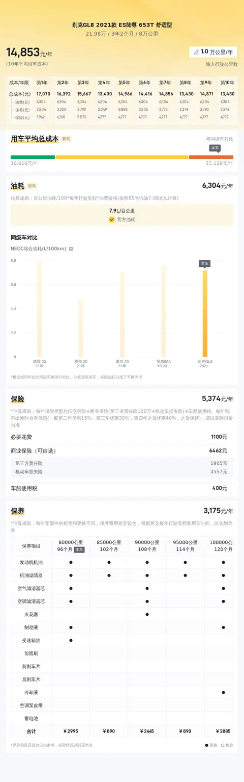 市场行情方面,同车系二手车价格在17.85万至23.21万之间,本车报价21.98万,处于相对合理的区间。根据估算,这辆车年均综合用车成本大概在每年1.5万元左右。