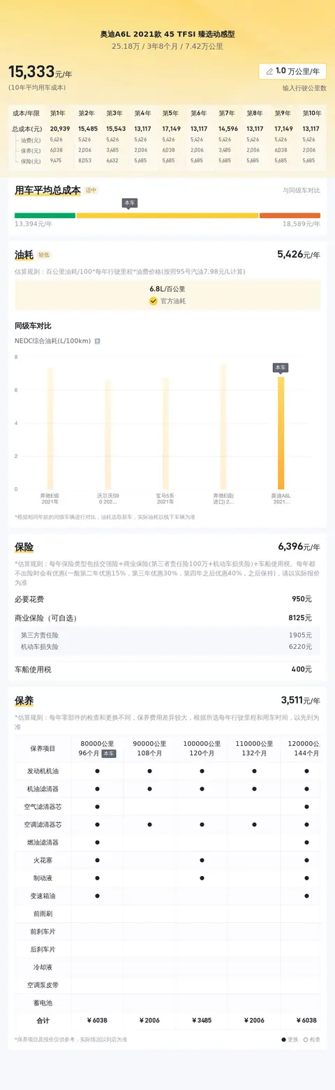根据懂车帝的预估,这辆奥迪A6L 2021款 45 TFSI 臻选动感型的10年平均用车成本约为15180元/年,这一成本在同级别车型中处于较高水平。其中,油耗成本约为8808元/年,保险费用约为5088元/年,保养成本约为205元/年。考虑到这款车的性能和配置,这一用车成本是可以接受的。