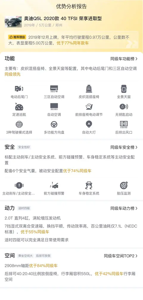 这辆奥迪Q5L 2020款 40 TFSI 荣享进取型是黑色车身,浅色内饰,车源地跟上牌地均在郑州,2019年12月上牌,表显里程5万公里,过户1次,新车含税价42.35万,二手车报价15.98万,过户次数1次,比新车省26.37万,节省率62.3%,最近6个月降价两次,从18.68万降到了现在的15.98万,降幅19.8%。这个价格在全国同款车价格排行中位于后20%,是一个不错的价格了。预计再行驶2年后可卖12万,保值率挺高的。