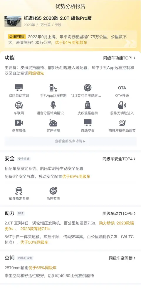 这辆红旗HS5 2023款 2.0T旗悦Pro版配备了全速域自适应巡航、L2级驾驶辅助、手机App远程控制、双区自动空调等配置,其中手机App远程控制和双区自动空调同级领先。在安全配置上,标配主动刹车/主动安全系统、前方碰撞预警、车道保持辅助系统等主动安全配置,配备6个安全气囊,被动安全配置优于89%同级车。在动力上,搭载的是2.0T直列4缸,涡轮增压发动机,百公里加速仅7.6s,动力秒杀2023款瑞虎9、2023款零跑C11,8AT手自一体变速箱,换挡平顺,传动效率高,百公里油耗仅7.3L(WLTC标准),优于50%同级车。在车身尺寸空间上,2870mm轴距优于66%同级车,乘坐空间和舒适性较好,后排可40:60比例放倒座椅。