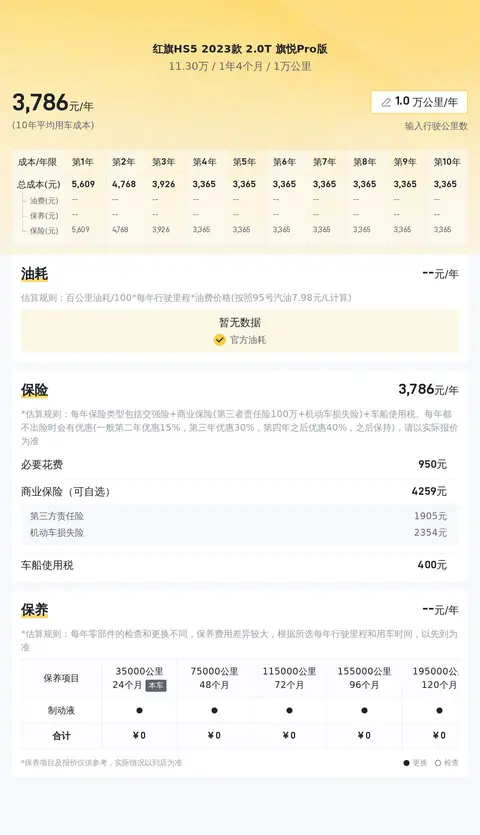 这辆红旗HS5 2023款 2.0T旗悦Pro版的二手车报价为11.3万,本车目前售价11.3万,预计再行驶2年后可卖8万,约折价23.7%。这辆车的用车成本较低,10年用车成本约为10万元,平均每年用车成本约为1万元,其中油费约6170元/年,保险费用约4147元/年,保养费用约1152元/年。