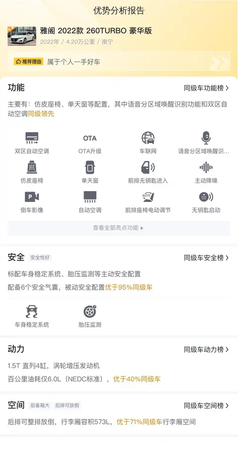 雅阁2022款260turbo豪华版,搭载1.5T直列4缸,涡轮增压发动机,百公里油耗仅6.0L(NEDC标准),优于40%同级车,官方百公里加速成绩为9.1s,虽然不突出,但也属于正常水准。在配置方面,该车配备了仿皮座椅、单天窗等配置,其中语音分区域唤醒识别功能和双区自动空调同级领先。雅阁2022款260turbo豪华版在安全性方面表现出色,其标配了车身稳定系统、胎压监测等主动安全配置,配备6个安全气囊,被动安全配置优于62%同级车。在同级别车型中,雅阁2022款260turbo豪华版的后排空间表现出色,后排可整排放倒,行李厢容积573L,优于71%同级车行李厢空间。