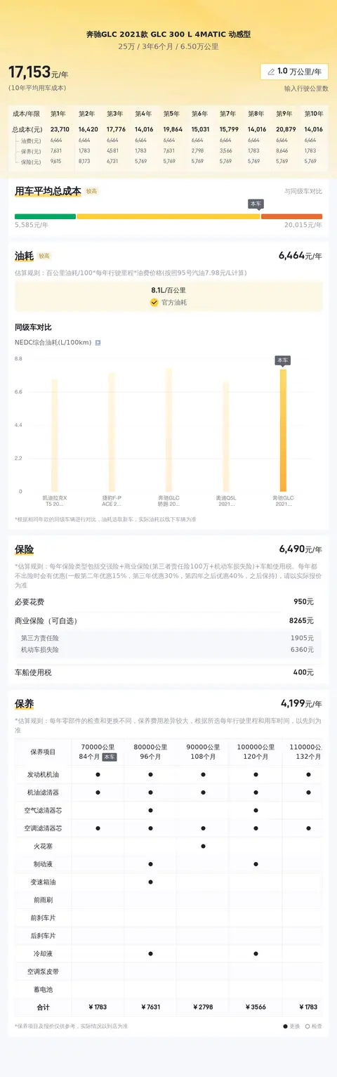 据估算,同级车用车成本最低6705元/年,最高19380元/年,奔驰GLC 2021款 GLC 300 L 4MATIC 动感型的用车成本是16778元/年,用车成本较高。