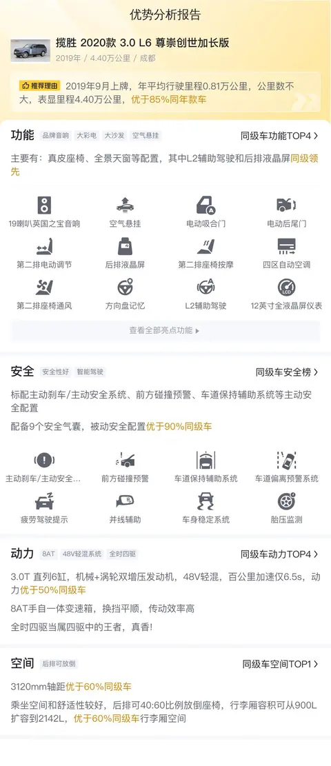 综上所述的新车含税价、用车成本、市场行情、优势分析、同款比价等数据仅供参考。在配置部分,因为二手车非标品,车辆可能会存在配置改装的情况,具体车况信息需要线下结合车辆实际情况进行综合参考。
