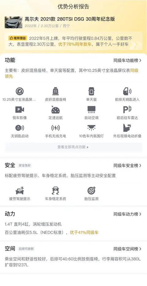 综上所述,高尔夫 2021款 280TSI DSG 30周年纪念版在配置、动力性能、空间、驾驶感受、安全配置等方面均表现出色,是一款值得推荐的车型。然而,对于二手车市场而言,车况信息变得尤为重要。由于这台车没有提供第三方检测报告,所以还是那句话,建议您在实地看车的时候,一定要向卖家询问清楚车辆的历史维修记录,并且仔细观察车辆的外观内饰是否存在瑕疵等等,避免出现不必要的误会和纠纷。一旦车辆的其他方面都没有什么大问题的话,结合这台车合理的市场定价,说它是一台不可多得的优质二手车源也并不为过。