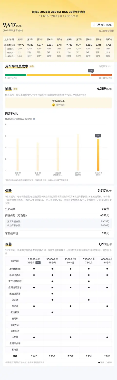 根据懂车帝大数据分析,目前这款二手高尔夫 2021款 280TSI DSG 30周年纪念版的市场价格区间为10.04万-12.28万之间,具体的价格因车辆的车况而有所不同。咱们今天介绍的这台车目前报价为11.68万,相较于新车含税价16.38万来说,具有一定的性价比。关于用车成本方面,根据懂车帝大数据分析,该车的10年平均用车成本大约在9402元/年,与同级别车相比处于适中的区间内,总体表现适中。具体数字还是要以实车为准。