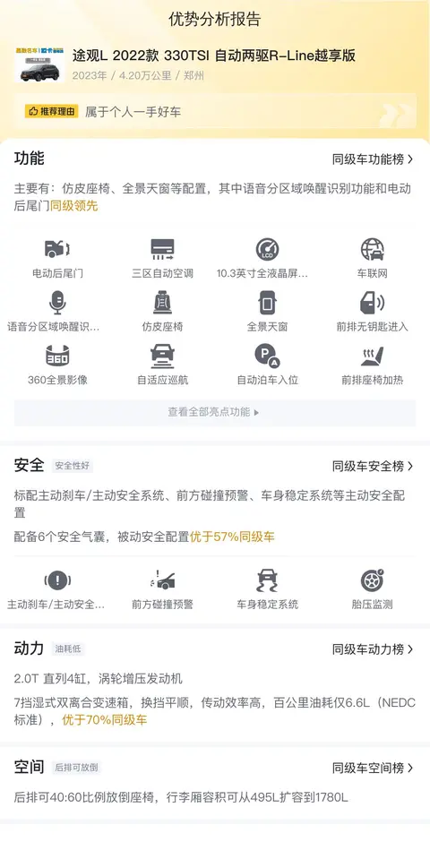 最后,我们来聊聊这款途观L 2022款 330TSI 自动两驱R-Line越享版相比同级别竞品车型,在配置和功能上有哪些优势和特点。通过大数据分析,该车在辅助操控配置、舒适配置、安全性方面有一定优势。具体表现为:仿皮座椅、全景天窗等配置,其中语音分区域唤醒识别功能和电动后尾门同级领先。电动后尾门和全景天窗不仅提升了使用的便利性,还增加了车内的采光和舒适度。而语音分区域唤醒识别功能则让车内的人机交互更加智能和个性化。